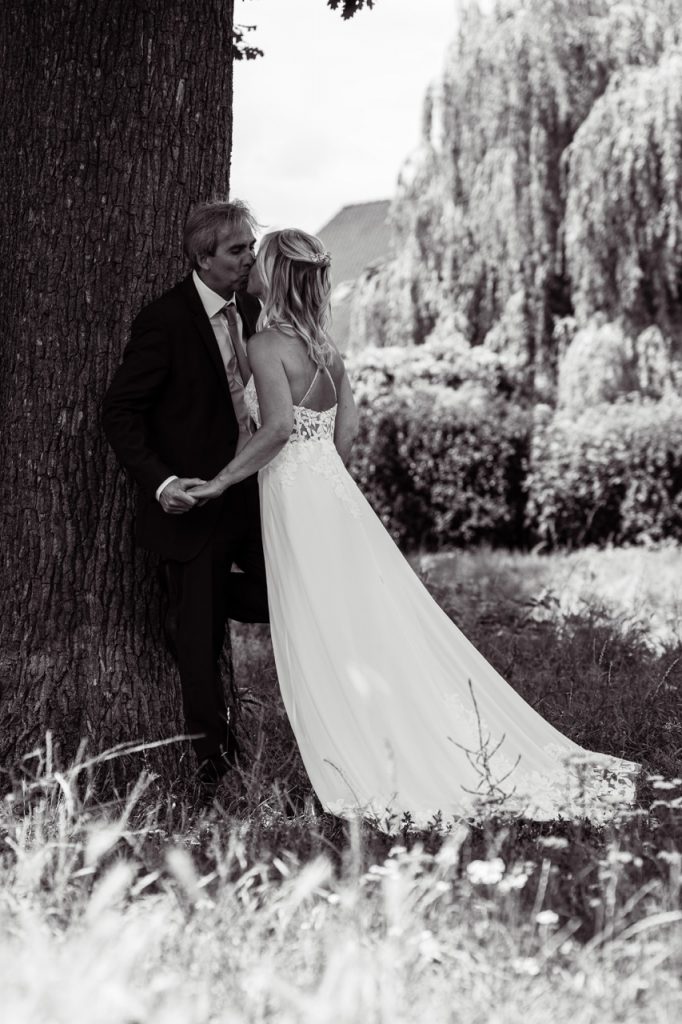 Keine Sorge, wir werden trotzdem wunderschöne Fotos machen! Meistens gibt es am Niederrhein immer eine Regenpause, die wir für kurze Shootings nutzen können. Zudem kenne ich viele Locations in Duisburg, Wesel oder Dinslaken, die überdachte Möglichkeiten bieten. Ich bringe auch immer schicke, durchsichtige Regenschirme mit, die auf Fotos richtig toll aussehen. Falls es gar nicht anders geht, können wir das Brautpaarshooting auf einen sonnigen Tag nach der Hochzeit verschieben – für euch ohne Aufpreis.