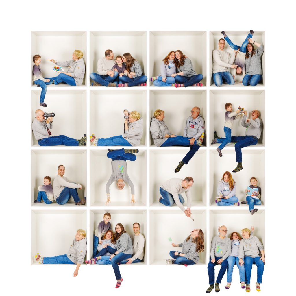 Ich fotografiere Euch mehrfach in meiner speziell angefertigten, über 1 qm großen Holzkiste. Für die kleinsten Stars – wie Babys oder Haustiere – habe ich auch eine kleinere Box parat. Später setze ich diese Einzelaufnahmen in Photoshop zu einer großen, quadratischen Collage zusammen.